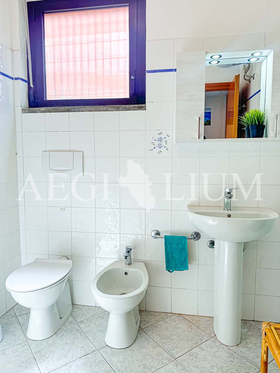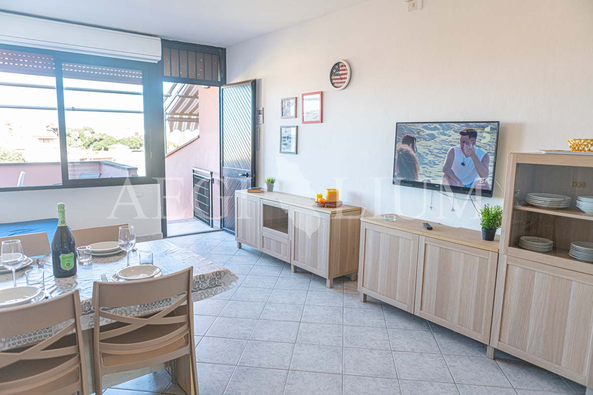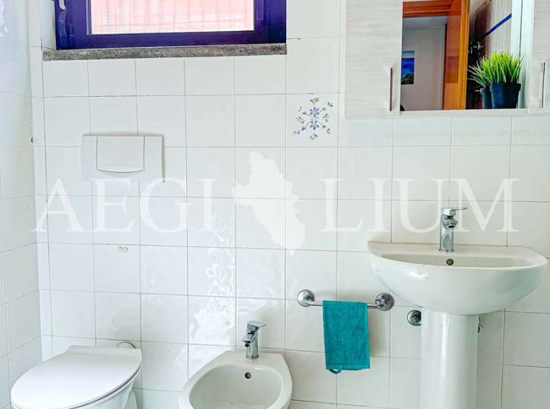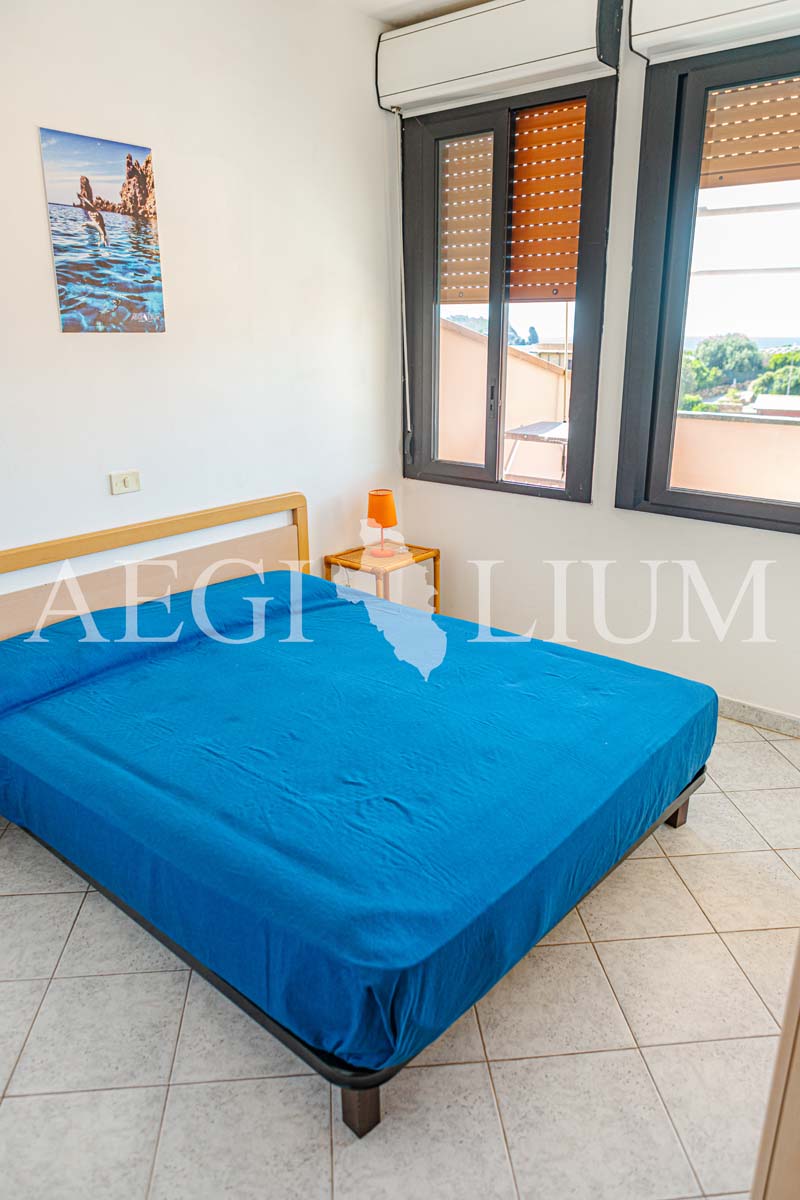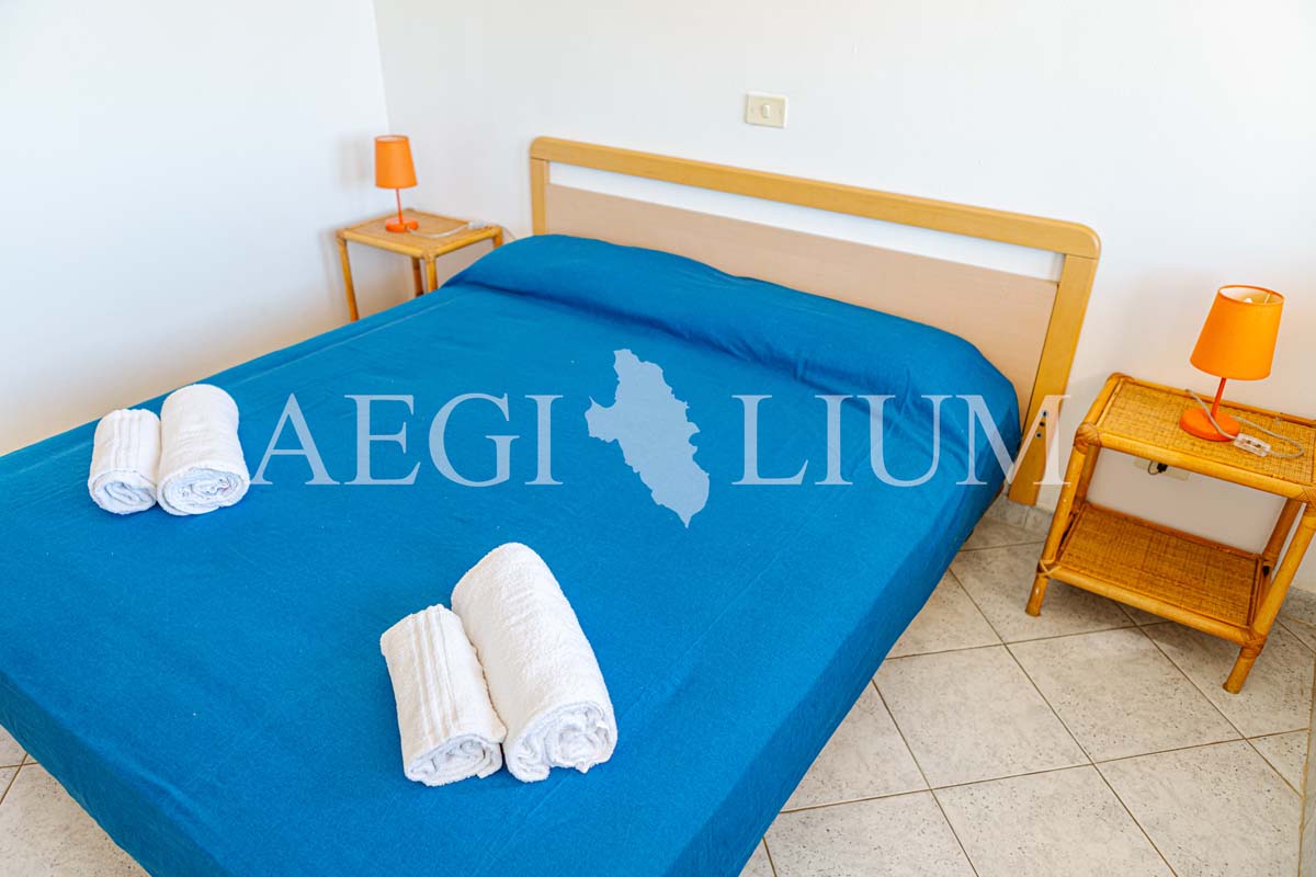 The apartment for rent has a simple and functional furniture consisting of: a double bedroom with ceiling fan, small bedroom with bunk bed and a small window (60x60 cm), living room with sofa bed with two single beds and ceiling fan, kitchenette, TV 40'', fridge with freezer, bathroom, washing machine, large terrace with sea view (about 20sqm) equipped for eating out, a parking space.