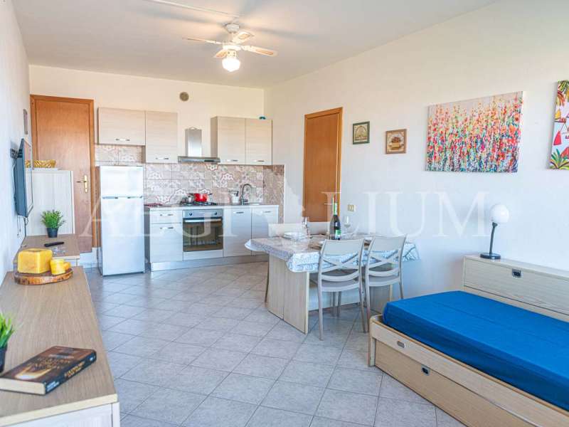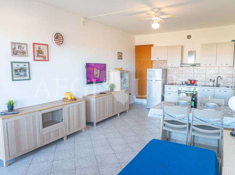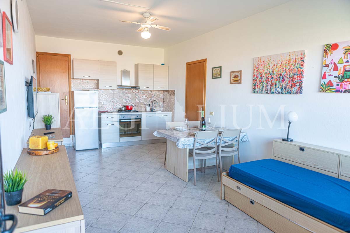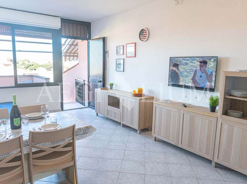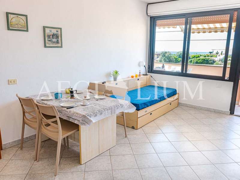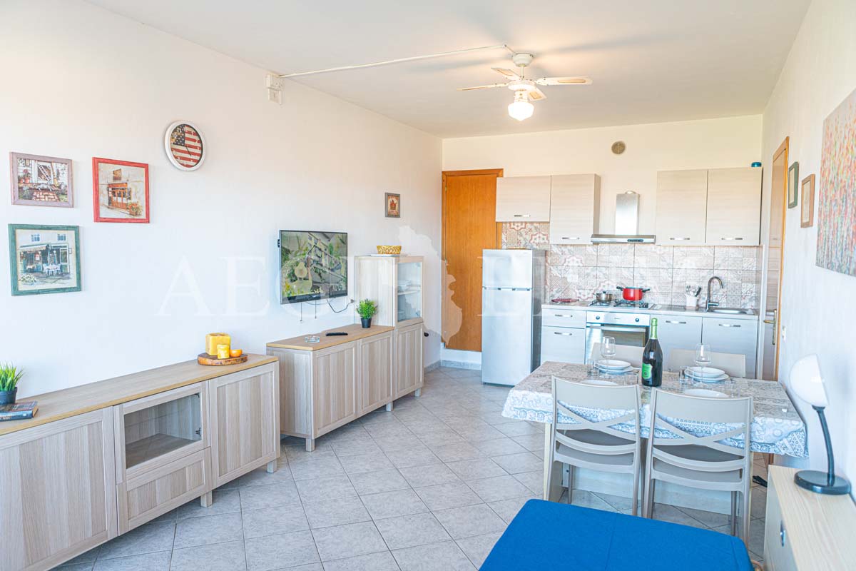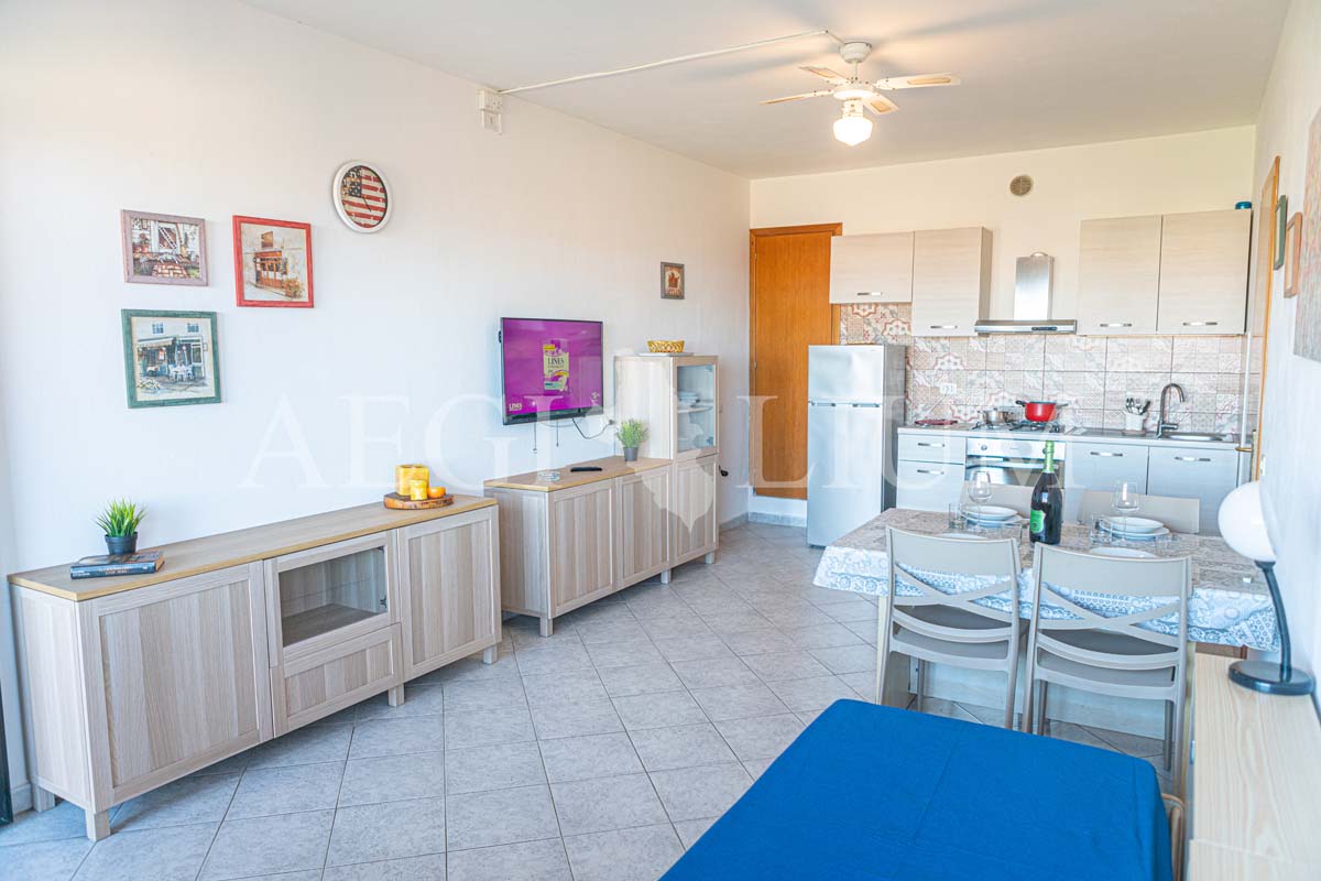 The apartment for rent has a simple and functional furniture consisting of: a double bedroom with ceiling fan, small bedroom with bunk bed and a small window (60x60 cm), living room with sofa bed with two single beds and ceiling fan, kitchenette, TV 40'', fridge with freezer, bathroom, washing machine, large terrace with sea view (about 20sqm) equipped for eating out, a parking space.